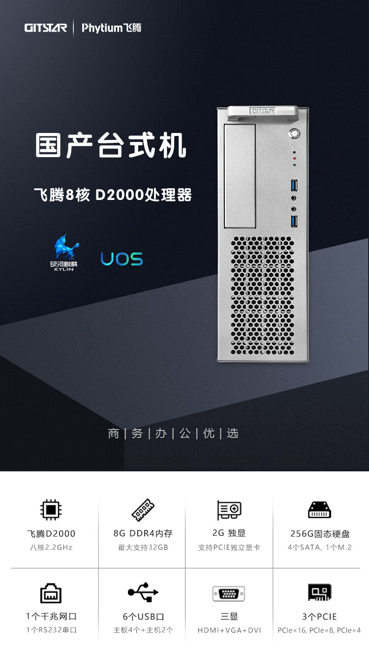 ¥7710.00GITSTAR集特 国产飞腾FT2000四核3C节能商用台式机GPC-100(16G/512GSSD+2T机械/AMD 2G独显/250W)