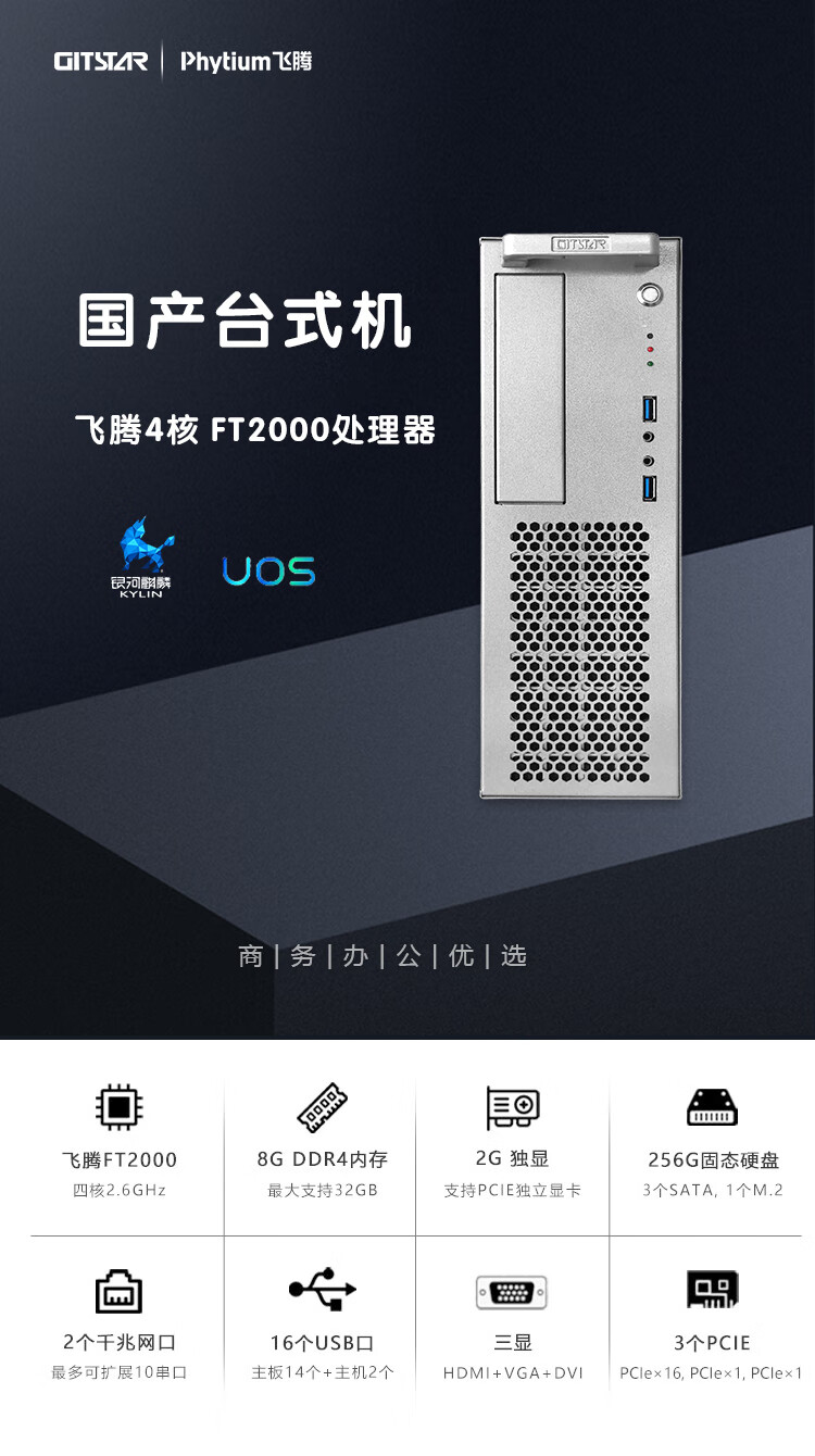 GITSTAR集特 国产电脑商用台式机GPC-100 飞腾FT2000四核/8G内存/256G固态/2G独显 3C节能 自营